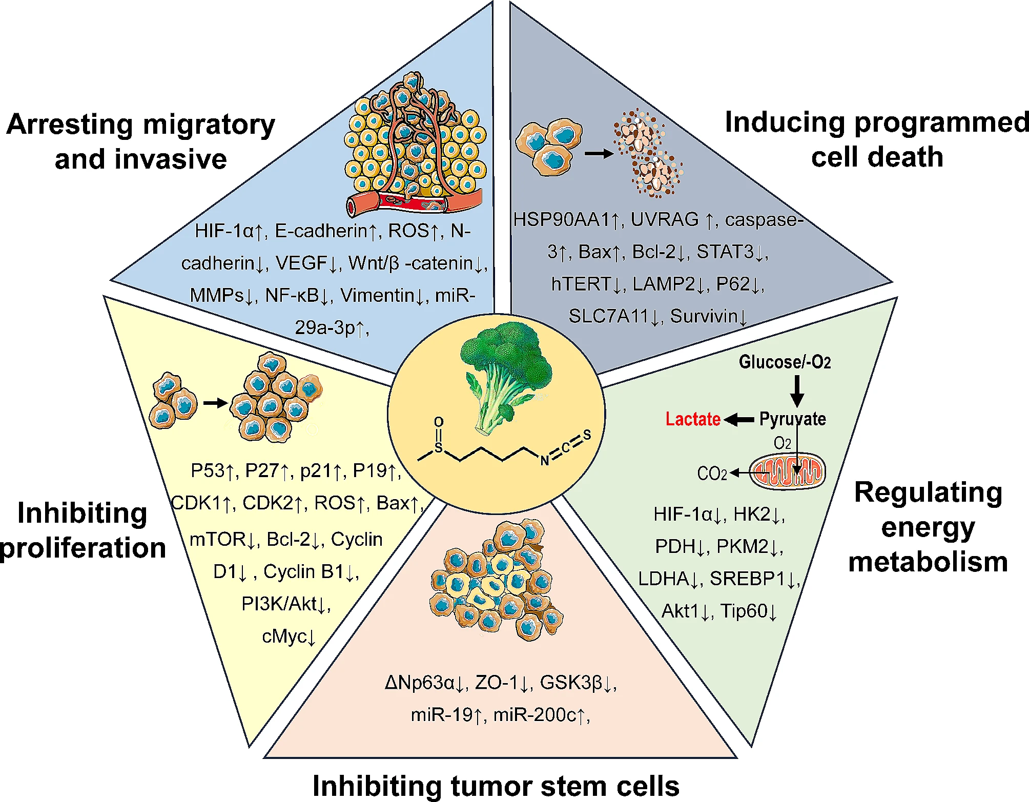 עדויות מתגברות מצביעות על כך שסולפורפאן (SFN) בעל יכולות אנטי-פרוליפרטיביות (ויסות צמיחה והתרבות של תאים סרטניים), אנטי-נדידה פולשני (גרורות), פרו-אפופטוטי (הרס תאי נגוע), מעכב, ומווסת מסלולי איתות מרובים, כולל PI3K (צמיחת תאים, התפשטות, התמיינות, תנועתיות, הישרדות ומטבוליזם תוך תאי), MAPK (פעילות מוטגנית) ו-NF-κB (גורם שעתוק של DNA, ייצור ציטוקינים והישרדות תאים).