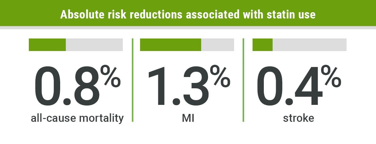 בעבודת המחקר נבחנו מחדש 21 ניסויים קליניים אקראיים. הממצאים שהושגו בהם לא היו אחידים באופן מובהק וכך גם שיעורי ההפחתה בסיכון: 0.8% לתמותה, 1.3% ל-התקפי לב, 0.4% לשבץ בקרב מי שנטלו סטטינים בהשוואה לקבוצת ביקורת שבה הממצאים היו 9%, 29% ו-14% בהתאמה.