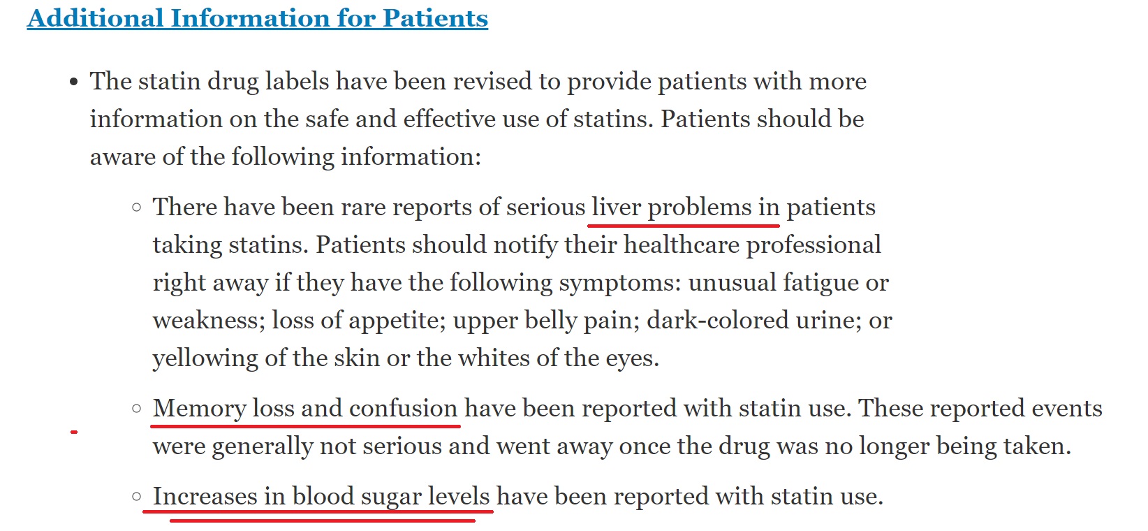 באיחור מסוים ולא באמת מספק ה-FDA הורה להכניס תיבת אזהרה לכל התרופות להורדת כולסטרול: (Lipitor, Lescol, Mevacor, Altoprev, Livalo, Pravachol, Crestor, simvastatin, Advicor, Simcor and Vytorin)
