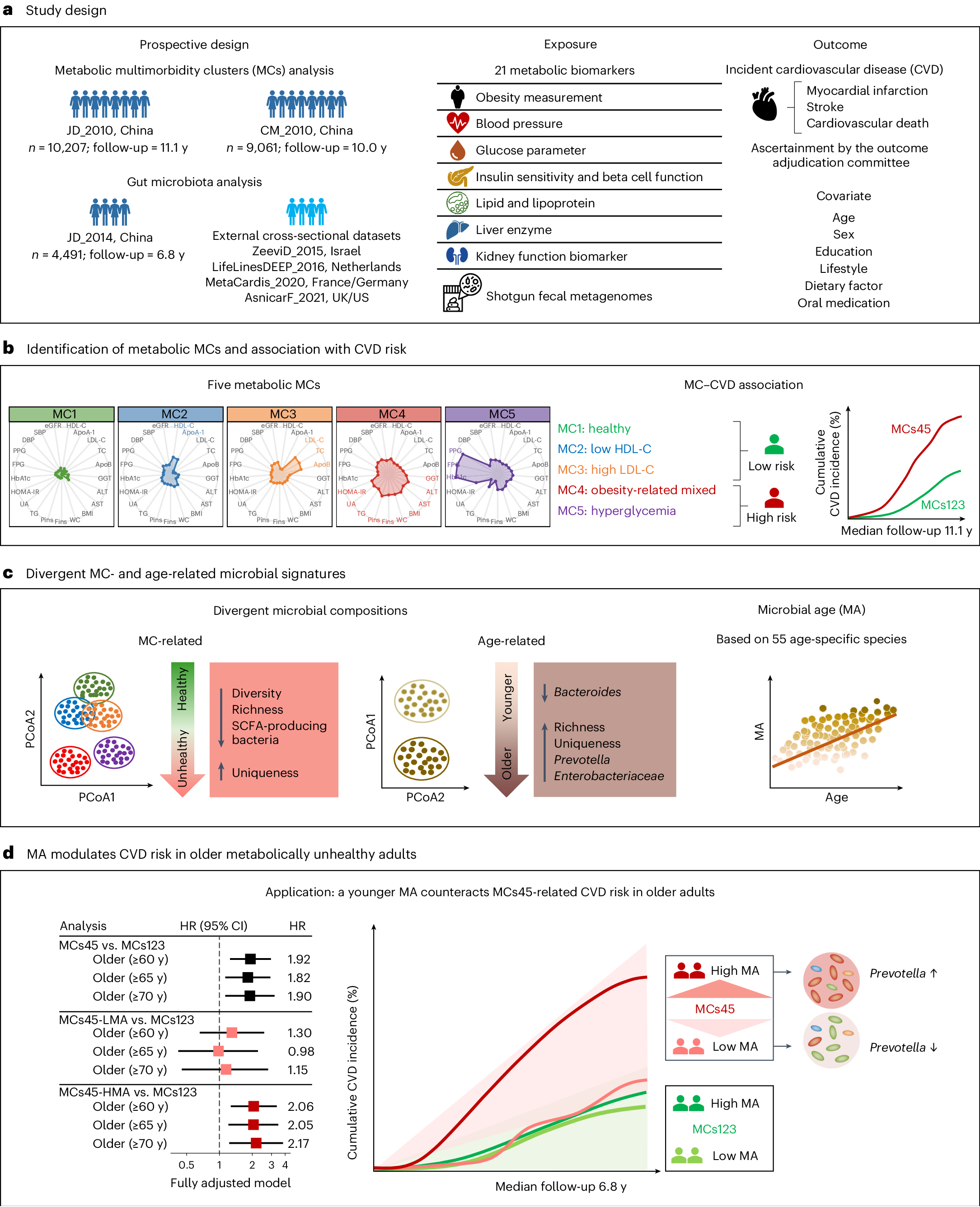 בנוסף נמצא שגיל חיידקים צעיר יותר הפך את הסיכון למחלות לב וכלי דם הקשורות לתפקוד מטבולי, דבר המצביע על כך שהמיקרוביום של המעי מווסת את בריאות הלב וכלי הדם אצל אנשים מבוגרים ולא בריאים מבחינה מטבולית.
