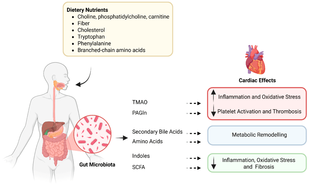 - טרימתילאמין N-אוקסיד (TMAO): חומר זה נוצר במעיים על ידי חיידקים מחומרים שמקורם במזון (כמו כולין). המחקר מצא כי הוא מקדם טרשת עורקים, דלקת ויצירת קרישי דם, ותורם להיפרטרופיה (הגדלת שריר הלב) ופיברוזיס בשריר הלב