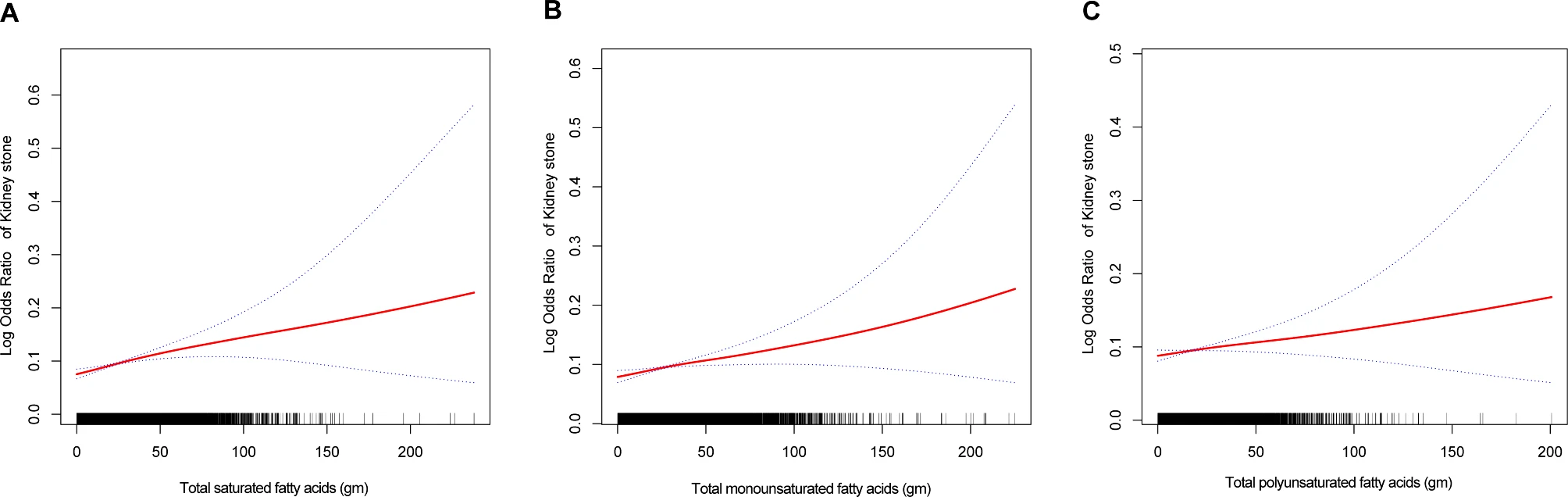 הניתוח גילה קשר חיובי בין צריכה מוגברת של כל חומצות השומן לבין סיכויים גבוהים יותר לפתח אבנים בכליות. ובאופן ספציפי יותר ההבדל בין הקבוצה הגבוהה לנמוכה הראה שעל כל עלייה יומית של 10 גרם בצריכת חומצות שומן רוויות (SFA), חד בלתי רוויות (MUFA) ורב בלתי רוויות (PUFA) היתה עליה בסיכון לאבנים בכליות ב-22%, 10% ו-21%, בהתאמה.