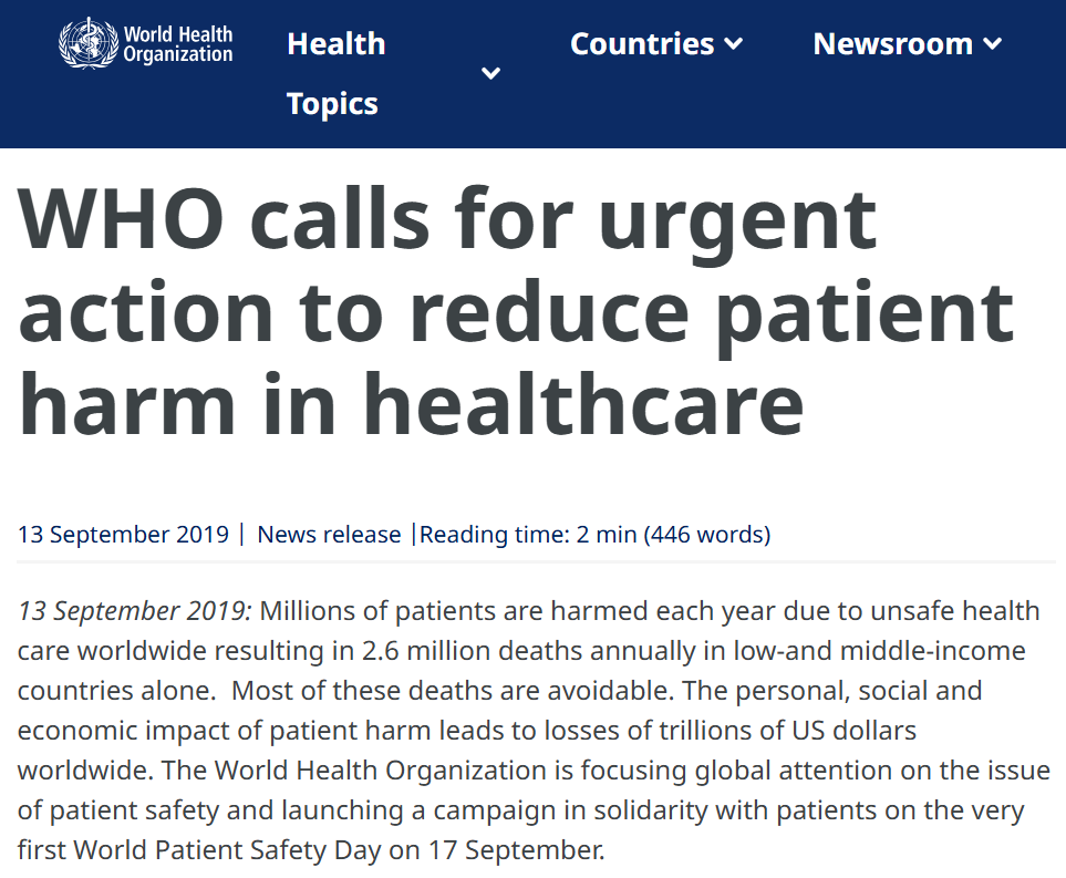 https://www.who.int/news-room/detail/13-09-2019-who-calls-for-urgent-action-to-reduce-patient-harm-in-healthcare