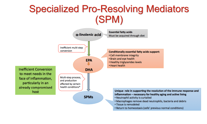 וראו שאלה שצרכו אומגה 3 היה ריכוז גבוה בדם של מולקולות מיוחדת בשם Specialized pro–resolving mediators הכוללים (lipoxins, resolvins, protectins, and maresins) ובקיצור SPMs, שמסונתזות מחומצות שומן רב בלתי רוויות, שתפקידן הוא לאותת למערכת החיסון ולהפעיל כדוריות דם לבנות (לויקוציטים) ובעזרתם הם יודעים "לנצח" (orchestrating) על תהליך הדלקת.