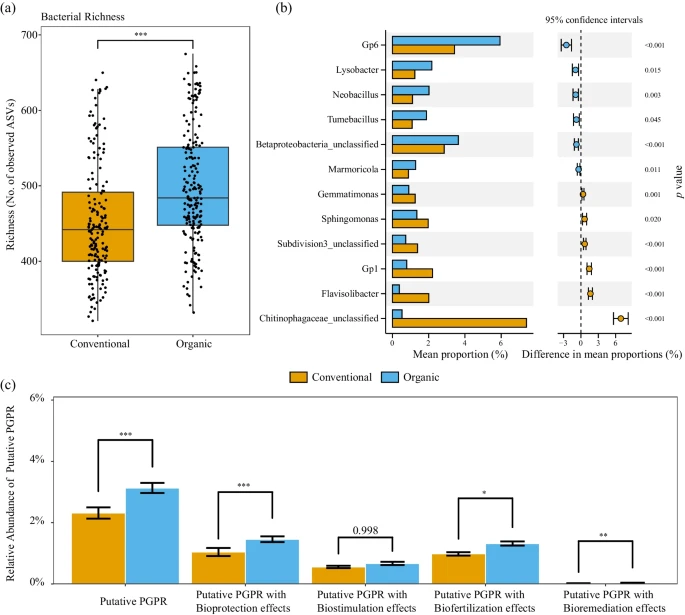 הם ניתחו 179 דגימות של אדמה חקלאית אורגנית ו-200 דגימות מאדמה חקלאית קונבנציונלית. הניתוח השווה את המגוון והפונקציונליות של קהילות מיקרוביאליות בין שתי המערכות וכיצד הבדלים בתכונות הקרקע תורמים לשינויים בשפע ובמגוון החיידקים.