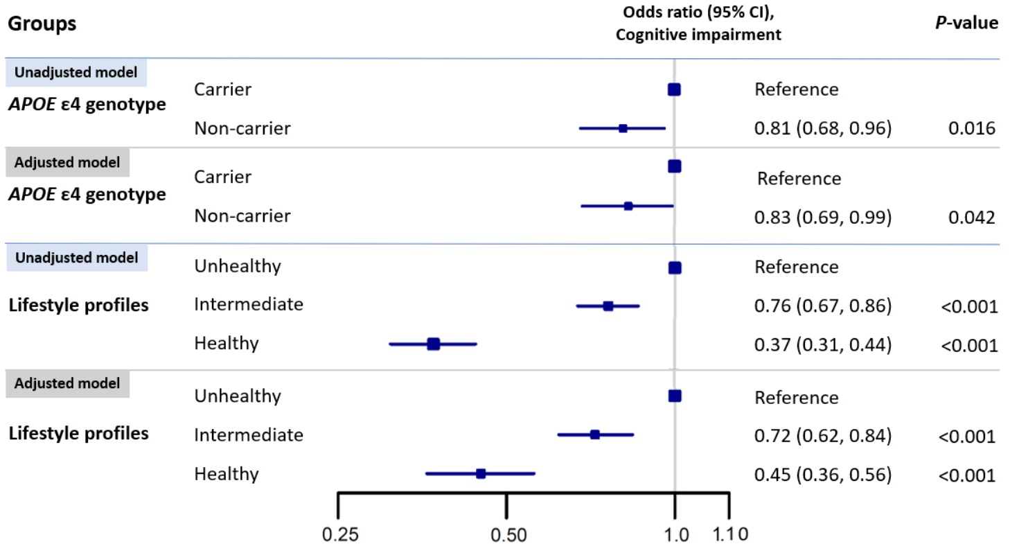 הניתוח אישר כי משתתפים עם אורח חיים בריא או אורח חיים בריא בינוני היו בסיכון נמוך משמעותית ללקות קוגניטיבית בהשוואה לאלה עם אורח חיים לא בריא, בשיעור של 55 ו- 28 אחוזים, בהתאמה. החקירה הראתה שהקשר בין אורח חיים ופגיעה קוגניטיבית לא השתנה באופן משמעותי בהתבסס על מצב APOE ε4 שייצג את הסיכון לדמנציה גנטית. זה מצביע על כך ששמירה על אורח חיים בריא יכולה להיות חשובה לשמירה על תפקוד קוגניטיבי אצל מבוגרים מעל גיל 80, ללא קשר לסיכון הגנטי.