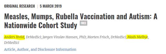 אם הייתי מציג פה בארץ את תכנית החיסונים של דנמרק היו קוראים לי מתנגד חיסונים או משוגע… את הסלקציה של פרויקט ה"גן המחוסגן" בטח שלא הייתי עובר… - מיהם אותם חוקרים והאם נתונים לניגודי עניינים? שני המחברים הראשיים (הראשון והאחרון) היו מחברים גם של מחקר מדסן 2002. מדסן ושני המחברים Hviid ו- Melbye, יחד עם פול ת'ורסן היו חלק מקבוצה של חוקרים דניים שמומנה על ידי ה-CDC בתחילת שנות ה-2000 וקיבלה כספים גם עבור עצמם.