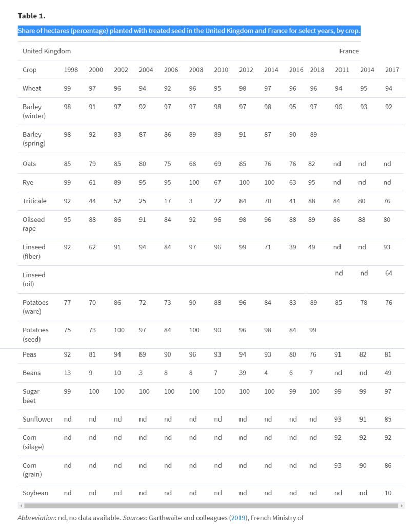 הצוות ניתח נתונים מ-Kynetec, חברת שיווק ומחקר גלובלית של צד שלישי שמחזיקה באחד ממערכי הנתונים המקיפים ביותר על שימוש בחומרי הדברה בארצות הברית, שנאספו בין השנים 2004-2014. הם גילו שהשימוש בטיפולי זרעים בארה"ב גדל בעשור האחרון, במיוחד בייצור תירס ופולי סויה. בתקופת 2012-2014, 90% משטחי התירס ו-76% מהשטחים של פולי הסויה גודלו עם זרעים מטופלים. מבין קוטלי החרקים שהוחלו על זרעים, ניאוניקוטינואידים היוו בערך 80%.