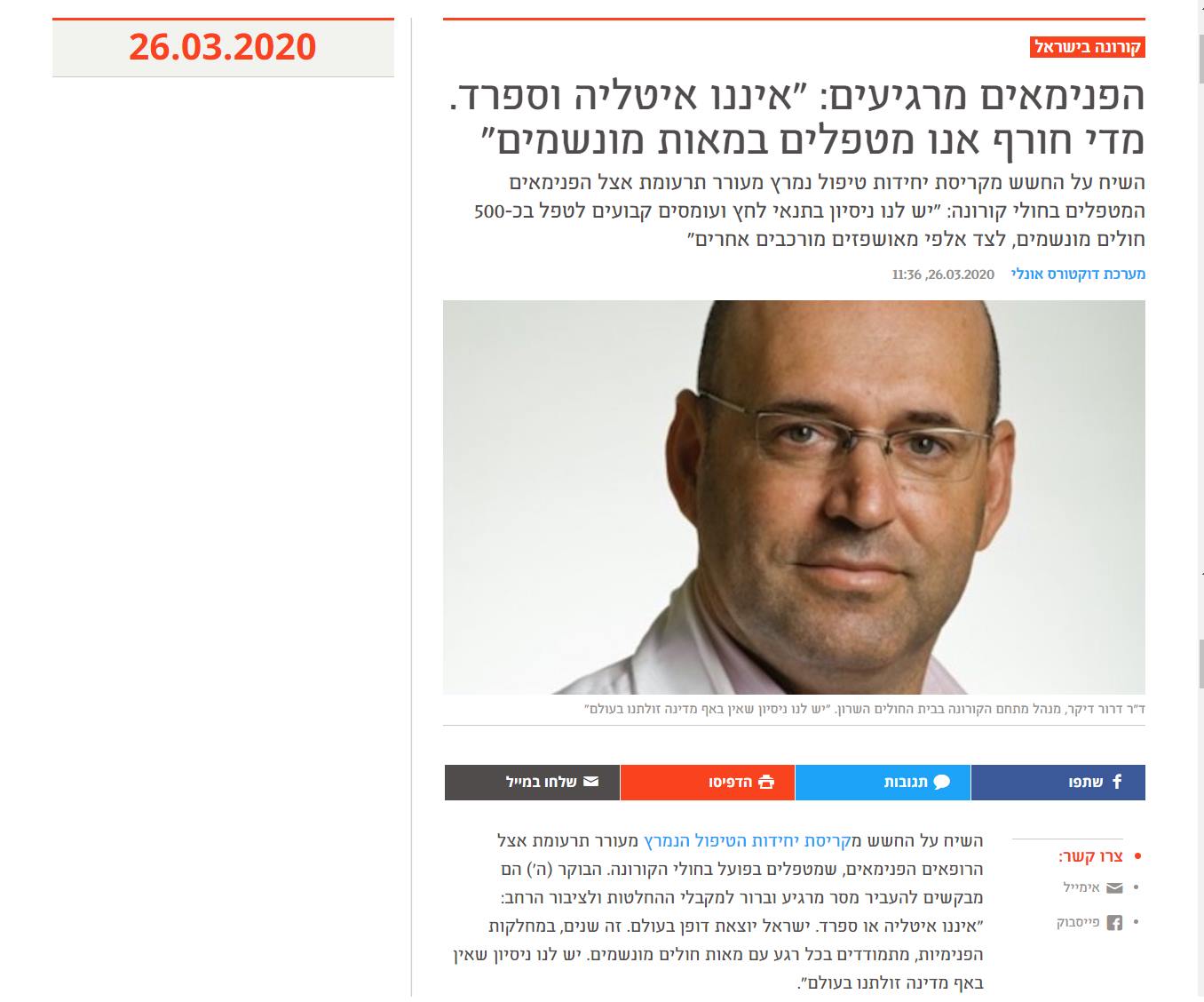 "איננו איטליה או ספרד. ישראל יוצאת דופן בעולם. זה שנים, במחלקות הפנימיות, מתמודדים בכל רגע עם מאות חולים מונשמים. יש לנו ניסיון שאין באף מדינה זולתנו בעולם