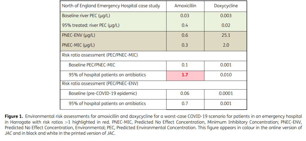We recommend more extensive environmental assessments be undertaken for all antimicrobial medicines used during pandemics. This will facilitate development of a robust evidence base in order to guide antibiotic prescribing choices that are less likely to increase AMR and have the least environmental impact, thus supporting the UK National Strategy. Such information could also inform future decisions on the location of emergency hospitals and wider drug and waste management to ensure optimal patient and environmental outcomes during pandemics.