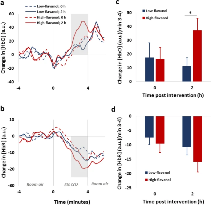 כשעתיים לאחר צריכת הקקאו, המשתתפים נשמו אוויר עם 5% פחמן דו חמצני שזה בערך פי 100 מהריכוז הרגיל באוויר (hypercapnia). זוהי שיטה סטנדרטית לאתגר את כלי הדם במוח כדי לקבוע עד כמה הם מגיבים. במצב תקין הגוף מגיב בדרך כלל על ידי הגברת זרימת הדם למוח, כי זה מביא יותר חמצן ומאפשר גם למוח לסלק יותר פחמן דו חמצני.