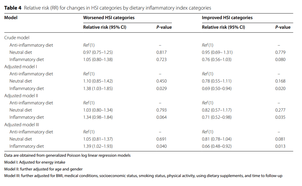 המחקר מצא שדיאטות דלקתיות העלו את הסיכון להחמרת סטאטוזיס ב-39% והורידו את הסיכון לשיפור סטאטוזיס בכבד ב-34% בהשוואה לדיאטות אנטי דלקתיות.