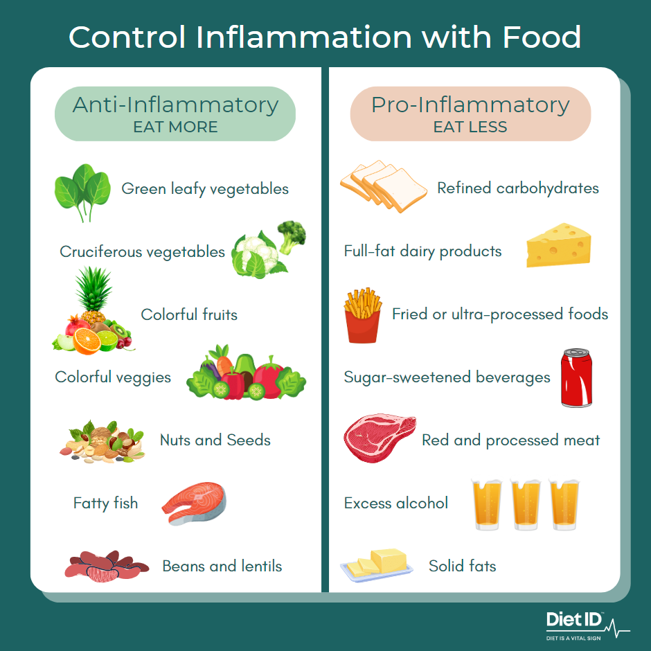 - בחירת מזונות ספציפיים: המחקר מציין כי DII מבוסס על עשרות רכיבי מזון בעלי השפעות פרו- ואנטי-דלקתיות, ומזהה כי רכיבים כמו חומצות שומן רוויות, פחמימות בעלות אינדקס גליקמי גבוה ויחס גבוה של אומגה 6 לאומגה 3 בתזונה קשורים לרמות דלקת מוגברות. מנגד, צריכת פירות, ירקות, סיבים, מגנזיום, חומצות שומן חד ורב בלתי רוויות ואומגה 3, פלבנואידים וקרוטנואידים קשורה להפחתת דלקת.