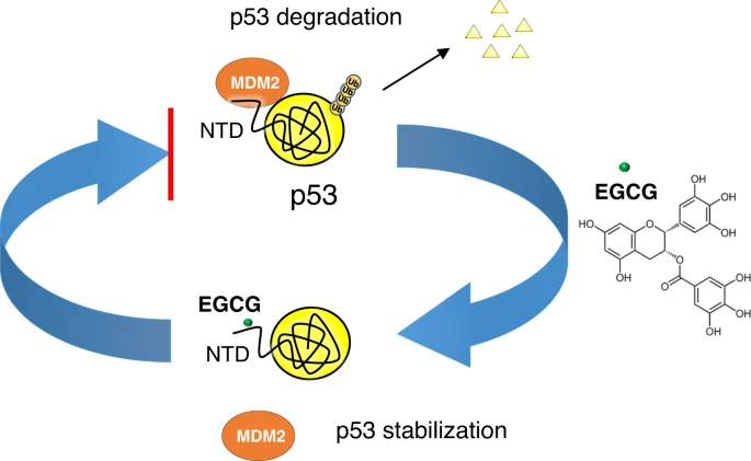 במחקר הנוכחי הם הראו אינטראקציה ישירה בין EGCG לחלבון p53. הם מצאו כי EGCG מונע את הירידה הטבעית והדי מהירה של רמות החלבון p53 לאחר הפקתו בגוף עקב קשירה עם חלבון אחר הנקרא MDM2. ה- EGCG למעשה מתחרה עם MDM2 על מקום ב- p53 וכתוצאה מכך הרמה של p53 גדלה וזה אומר שיש יותר p53 לתפקוד אנטי-סרטני.