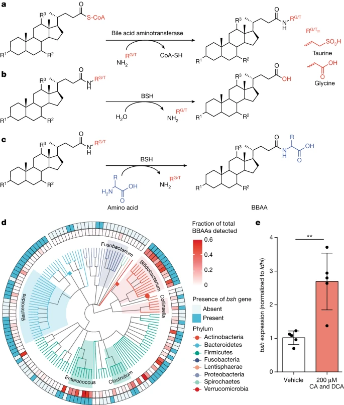 החוקרים, שפרסמו את תוצאותיהם בפברואר 24 בכתב העת Nature, זיהו תפקיד חדש לאנזים BSH. האנזים משנה חומצות מרה שנוצרו על ידי אדם ועכבר ומשנה את תצורותיהן על ידי, למשל, הוספת חומצות אמינו, מה שמוביל למולקולות חדשות הידועות כ-bacteria bile acid amidates, או BBAA. הצוות גם הראה, בפעם הראשונה, כי BBAA אלה נוצרים בבני אדם בלידה, במקביל להקמת המיקרוביום של המעי ביילודים.