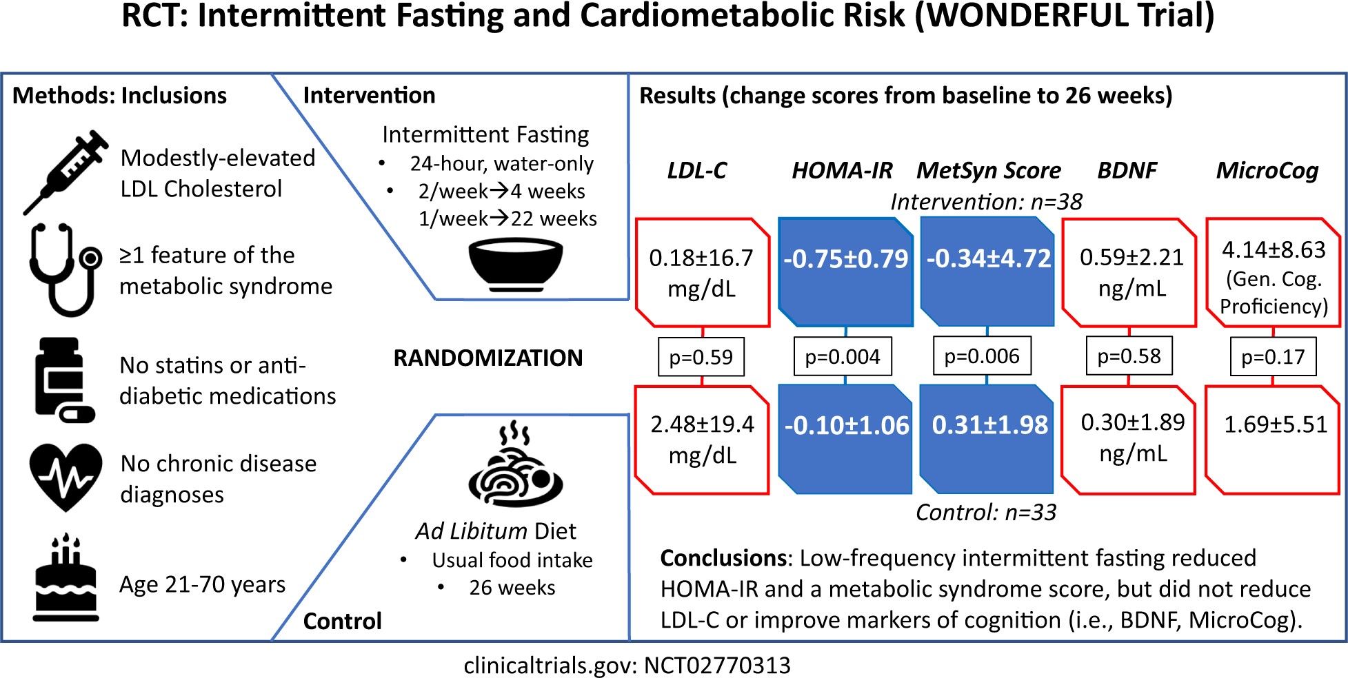 מחקר שפורסם בספטמבר 25 בכתב העת Frontiers in Nutrition בחן 103 נשים בגילאי 21-70 עם השמנת יתר או עודף משקל, שלא נוטלות סטטינים או תרופות להורדת סוכר. המשתתפות ביצעו צום של 24 שעות (מים בלבד) פעמיים בשבוע במשך ארבעה שבועות ולאחר מכן פעם בשבוע למשך 22 שבועות נוספים. בימים שאינם צום הן אכלו כרגיל וללא הנחיות ספציפיות.