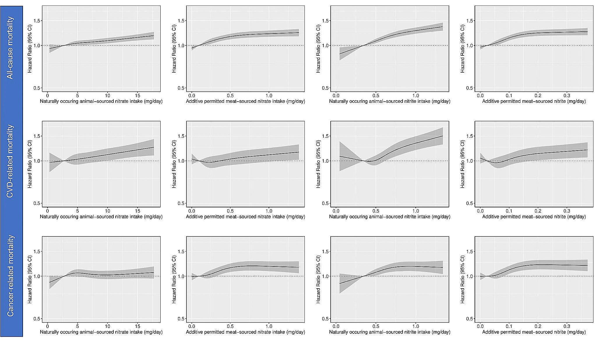 לעומת זאת, צריכה גבוהה יותר של חנקות מבעלי חיים הייתה קשורה לסיכון גבוה ב-9% ו-12% לתמותה מכל הסיבות ולתמותה הקשורה ל-CVD, בהתאמה. צריכה גבוהה יותר של ניטריט הנמצא באופן טבעי במזונות מהחי נמצאה קשורה לסיכון גבוה ב-25%, 29% ו-18% לתמותה מכל-סיבה, הקשורה למחלות לב וכלי דם וסרטן, בהתאמה.