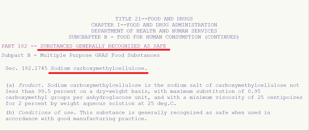 החוקרים טוענים שהחומר הזה לא נבדק בהרחבה בבני אדם, אך נעשה שימוש הולך וגובר במזון מעובד מאז שנות ה-60. זה זמן רב קיימת ההנחה ש-CMC בטוח לבליעה מכיוון שהוא מסולק בצואה מבלי להיספג, כלומר ישנה הנחה שהוא לא מגיע למחזור הדם ולכן הוא לא מסוכן.