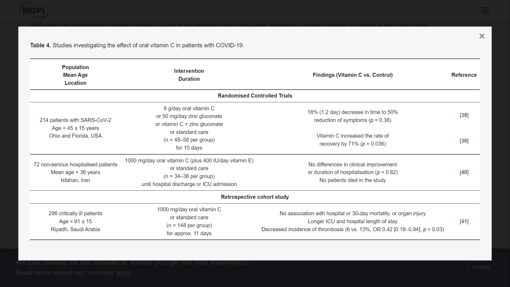 בסקירה של שנים עשר מחקרים, כולל חמישה מחקרים אקראיים מבוקרים, שפורסמה בנובמבר 21 בג'ורנל Life הצביעו החוקרים על כך שוויטמין C יכול לשפר את התוצאות עבור חולים עם זיהום קוביד-19.