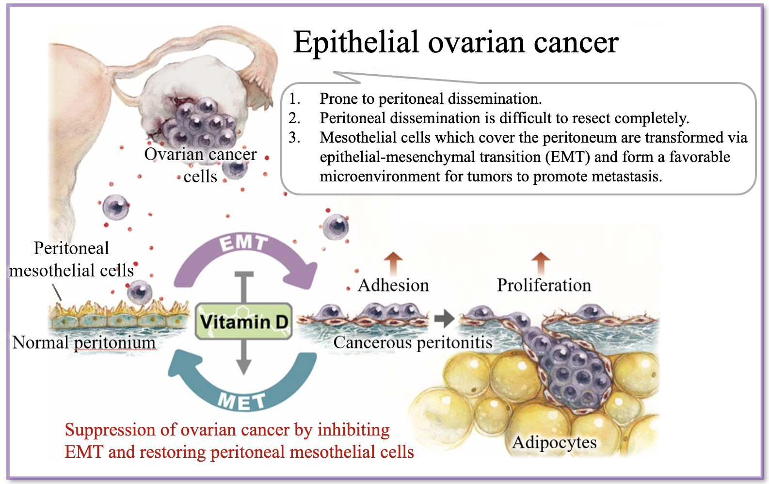 קבוצת החוקרים בראשות ד"ר Masato Yoshihara מהמחלקה למיילדות וגינקולוגיה, גילתה שוויטמין D לא רק מונע את התהליך הזה אלא גם שיקם תאי מזותל הקשורים לסרטן למצבם המקורי. תהליך זה חיזק את השפעת המחסום של תאי מזותל והפחית התפשטות נוספת של הסרטן. המחקר שלהם מצביע על כך שטיפול בוויטמין D עשוי להיות תוספת שימושית לטיפול בסרטן השחלות.