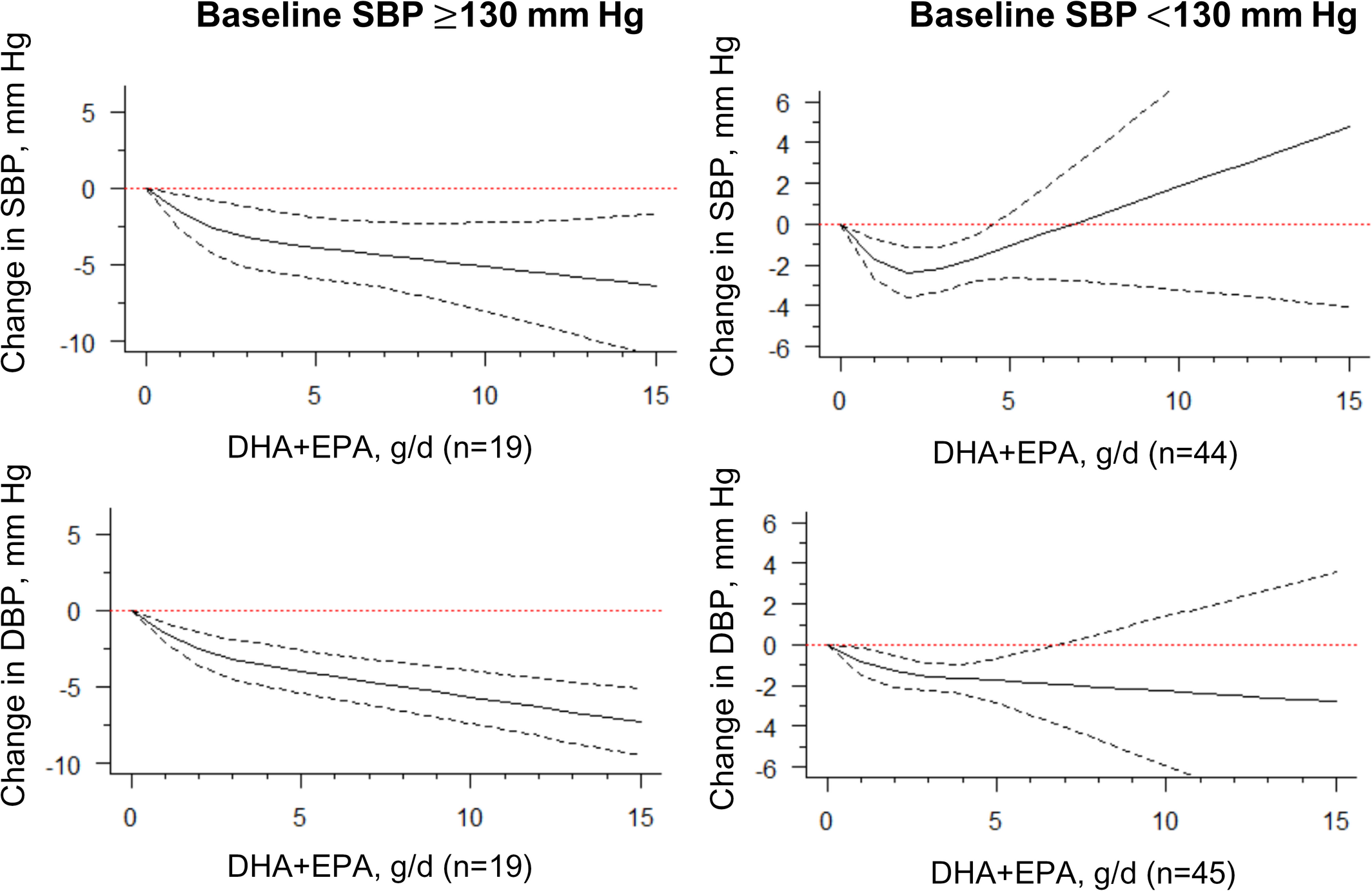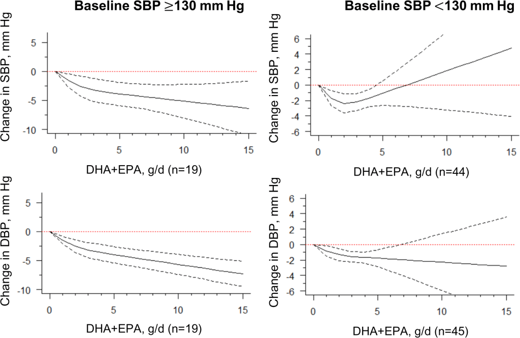 ב-5 גרם ליום של אומגה 3, ה-SBP ירד בממוצע של כמעט 4 מ"מ כספית עבור אלו עם יתר לחץ דם ופחות מ-1 מ"מ כספית בממוצע עבור אלו ללא.
