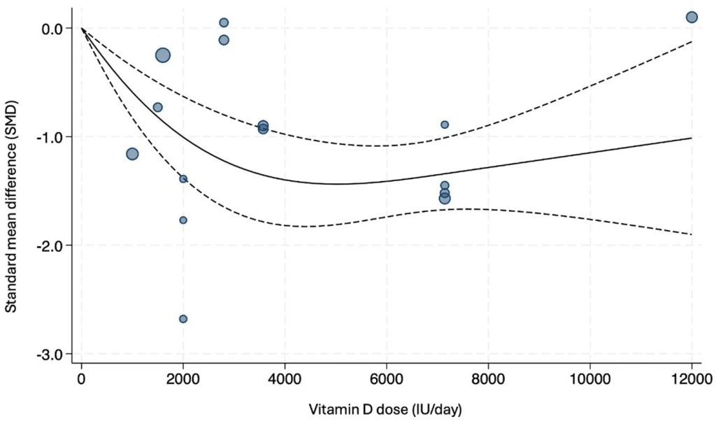 מטה-אנליזה שפורסמה במרץ 26 בכתב העת Frontiers in Nutrition, משרטטת לראשונה מפה מדויקת של "מנה-תגובה" (Dose-Response). המחקר, שניתח נתונים מ-15 ניסויים קליניים מבוקרים (RCTs), מצא כי תוספת של ויטמין D מובילה לשיפור מובהק ומרשים בתסמינים, כאשר השיא הטיפולי נצפה במינון יומי של 5,000 יחב"ל (IU). במינון זה, מדד חומרת הדיכאון הגיע לנקודת השפל הנמוכה ביותר, מה שמרמז כי המינונים הסטנדרטיים המומלצים לציבור הרחב עשויים להיות נמוכים מדי עבור מי שמתמודד עם הפרעות מצב רוח.