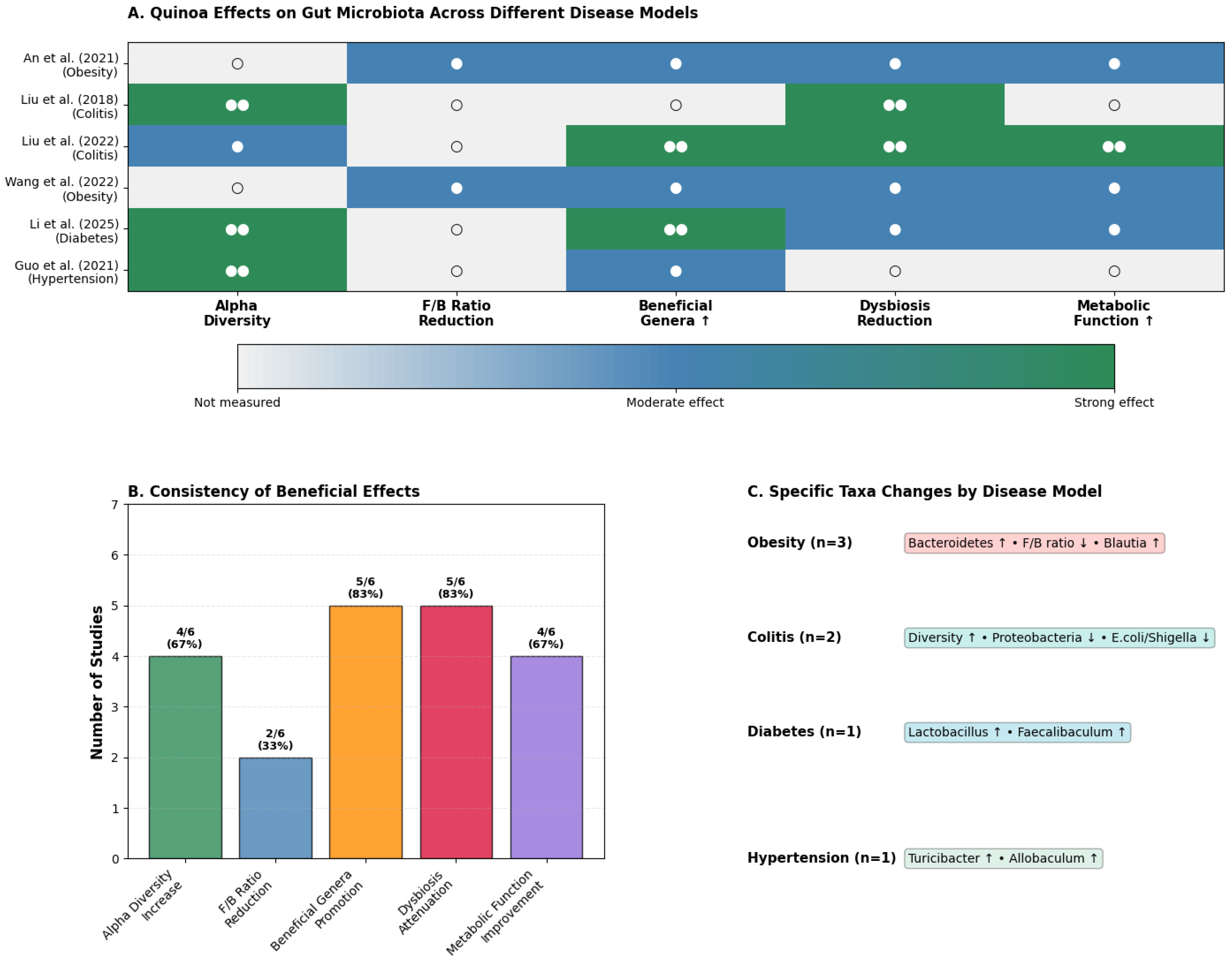 יתר על כן, הראיות הצביעו על תופעה של מודולציה של המיקרוביום על ידי הקינואה, הממקמת אותה כ"פרה-ביוטיקה מדויקת". במודלים של השמנה, לדוגמה, הפפטידים חוללו שינוי מבני במיקרוביום על ידי הפחתת יחס Firmicutes/Bacteroidetes, דפוס המקושר לפנוטיפ מטבולי רזה יותר. באופן דומה, במודלים של סוכרת, נצפתה העשרה ספציפית של סוגי חיידקים הקשורים לשיפור משק הסוכר (Faecalibaculum ו-Lactobacillus). החוקרים סיכמו כי ממצאים קדם-קליניים אלו מעניקים בסיס מכאניסטי איתן לקינואה כרכיב פונקציונלי.