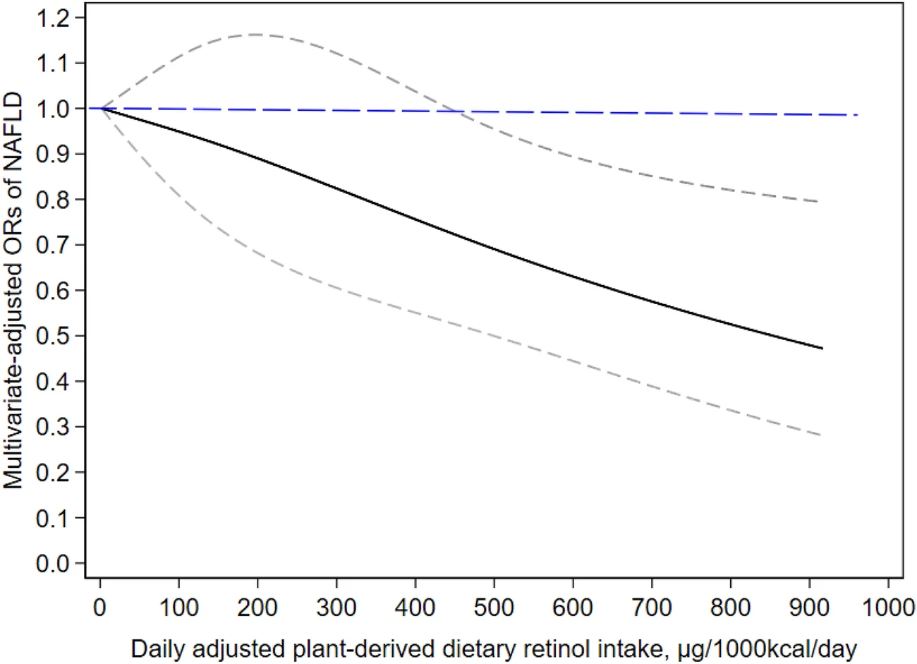 יתר על כן, נצפה גם קשר שלילי של מינון ותגובה ליניארי בין צריכת קרוטנואידים לבין הסיכון לפתח NAFLD.
