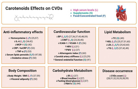 החוקרים סיכמו שרמות גבוהות של קרוטנואידים בדם קשורות להפחתת גורמי סיכון ל-CVD וסמנים דלקתיים, העלולים להפחית את הסבירות לאירועים קרדיו-וסקולריים. ניכר כי צריכת מגוון רחב של קרוטנואידים, בעיקר דרך מזון, עשויה לעכב את הופעתן והתקדמותן של מחלות אלה.