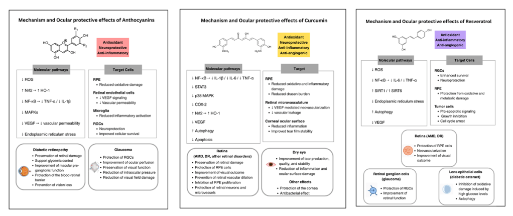 - רטינופתיה סוכרתית: השילוב של רזברטרול וכורכומין פועל לעיכוב חלבון ה-VEGF, ובכך עוצר את צמיחת כלי הדם הלא תקינים המאיימים על הראייה.