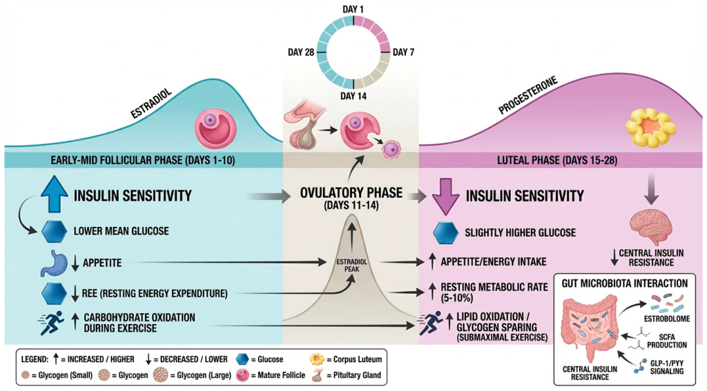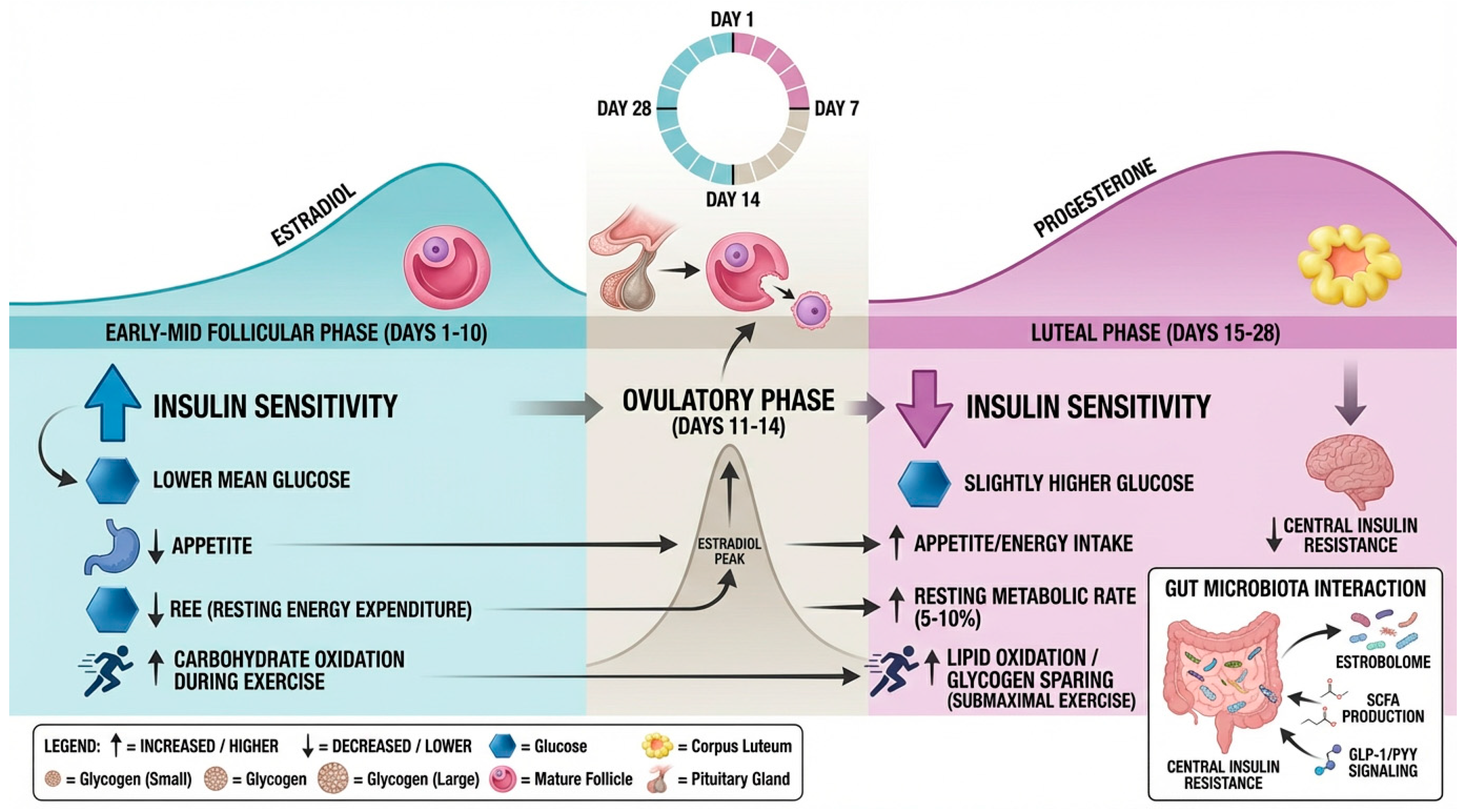 - הפרופיל הלוטאלי (אחרי ביוץ): עם עליית הפרוגסטרון וירידת הטסטוסטרון החופשי, הגוף עובר למצב של הוצאה אנרגטית מוגברת (עלייה של 5-10% בחילוף החומרים במנוחה). זהו שלב המאופיין ב"חיסכון בגליקוגן" ובנטייה מוגברת לחמצון שומנים (שריפת שומן), אך במקביל חלה ירידה קלה ברגישות לאינסולין המתבטאת גם ברמה המוחית (היפותלמוס) ועלולה להוביל לתנודות ברמות הסוכר.