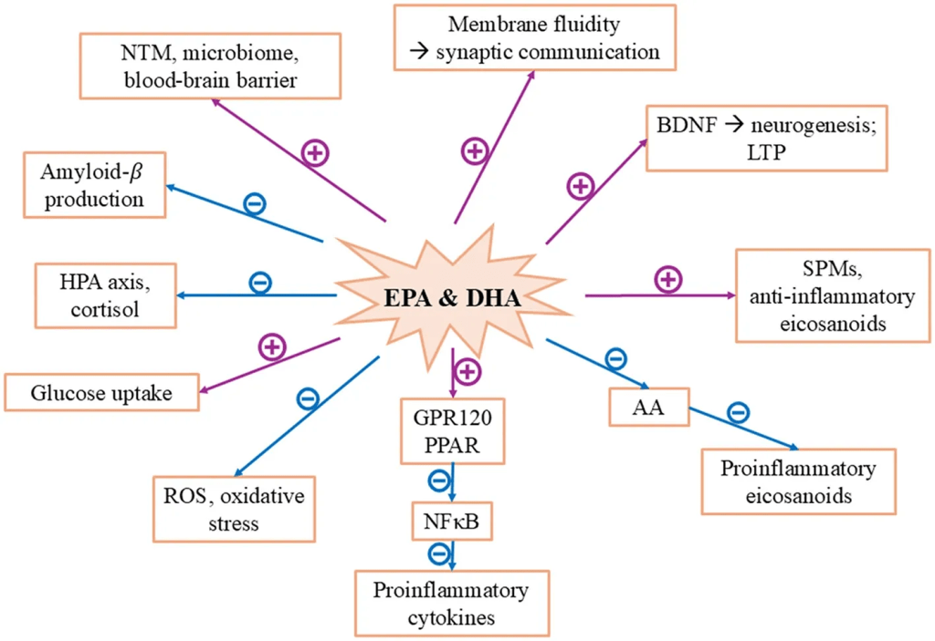 1. ויסות ציטוקינים ורזולוציה דלקתית: חומצות השומן הן חומרי המוצא למולקולות בשם Resolvins, הפועלות בתוך המוח כדי להפסיק באופן אקטיבי פעילות דלקתית ולהגן על הנוירונים מהרס.